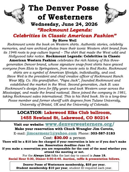 Rockmount Legends: Celebrities in Classic American Fashion Wednesday, June 24, 2026 5:30 PM 8:30 PM Denver, CO USA (map) Google Calendar ICS